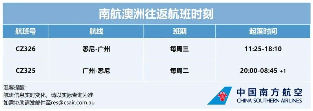 目前南航有悉尼直飞广州的CZ326航班,从悉尼飞回国是每周三,广州飞悉尼是每周二。