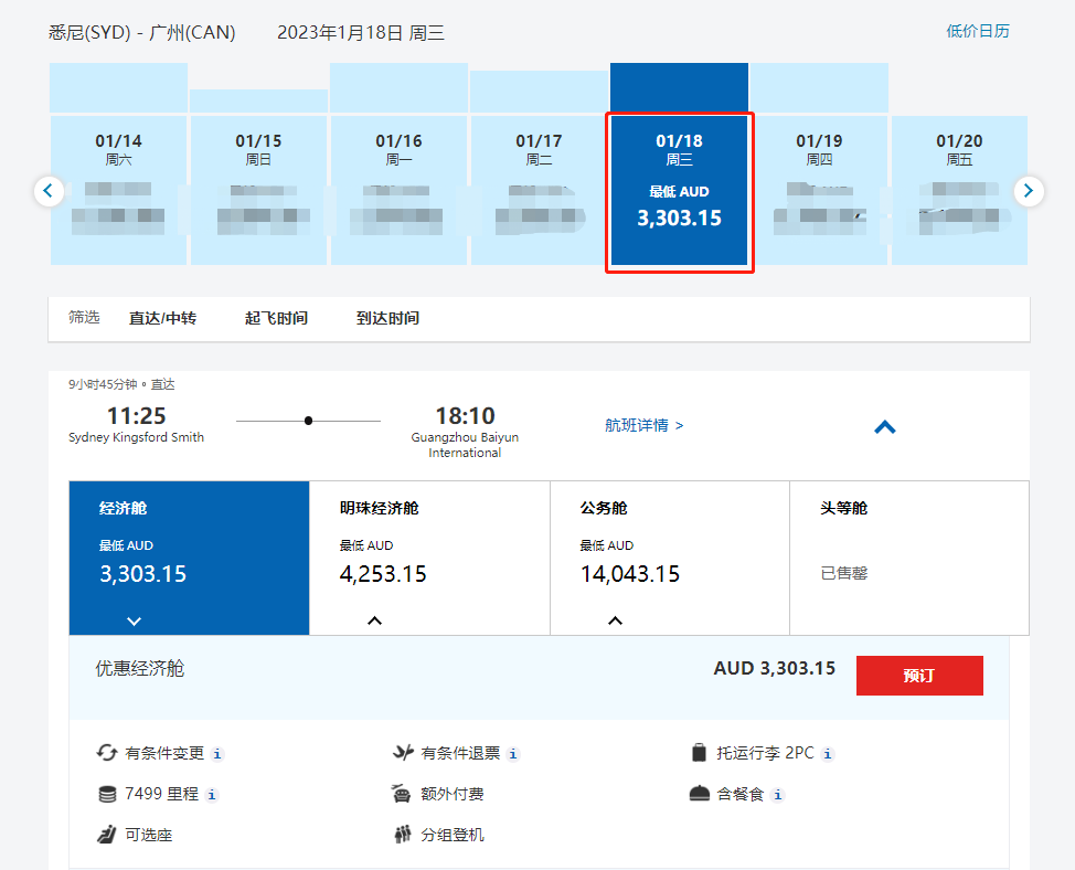 1月18日单程回国机票价格为含税3303澳币起。