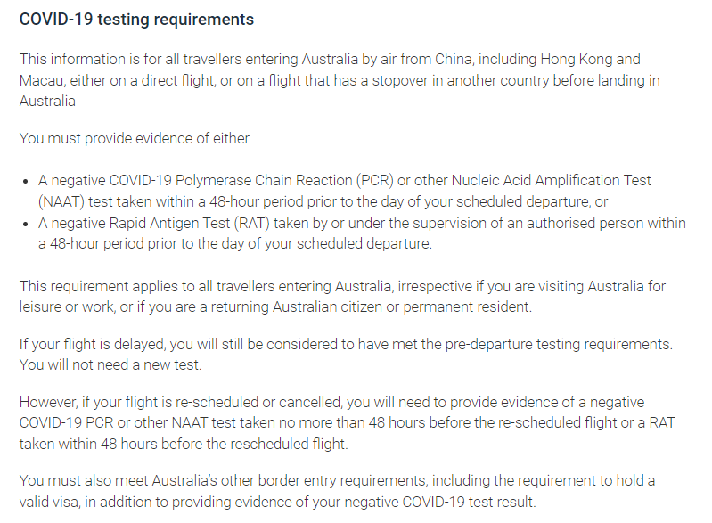 2023年1月5日起,从中国(包括香港和澳门)抵达澳大利亚的旅客,将被要求在旅行前48小时内进行一次新型冠状病毒检测,并在前往澳大利亚时出示一份阴性检测结果的证明。